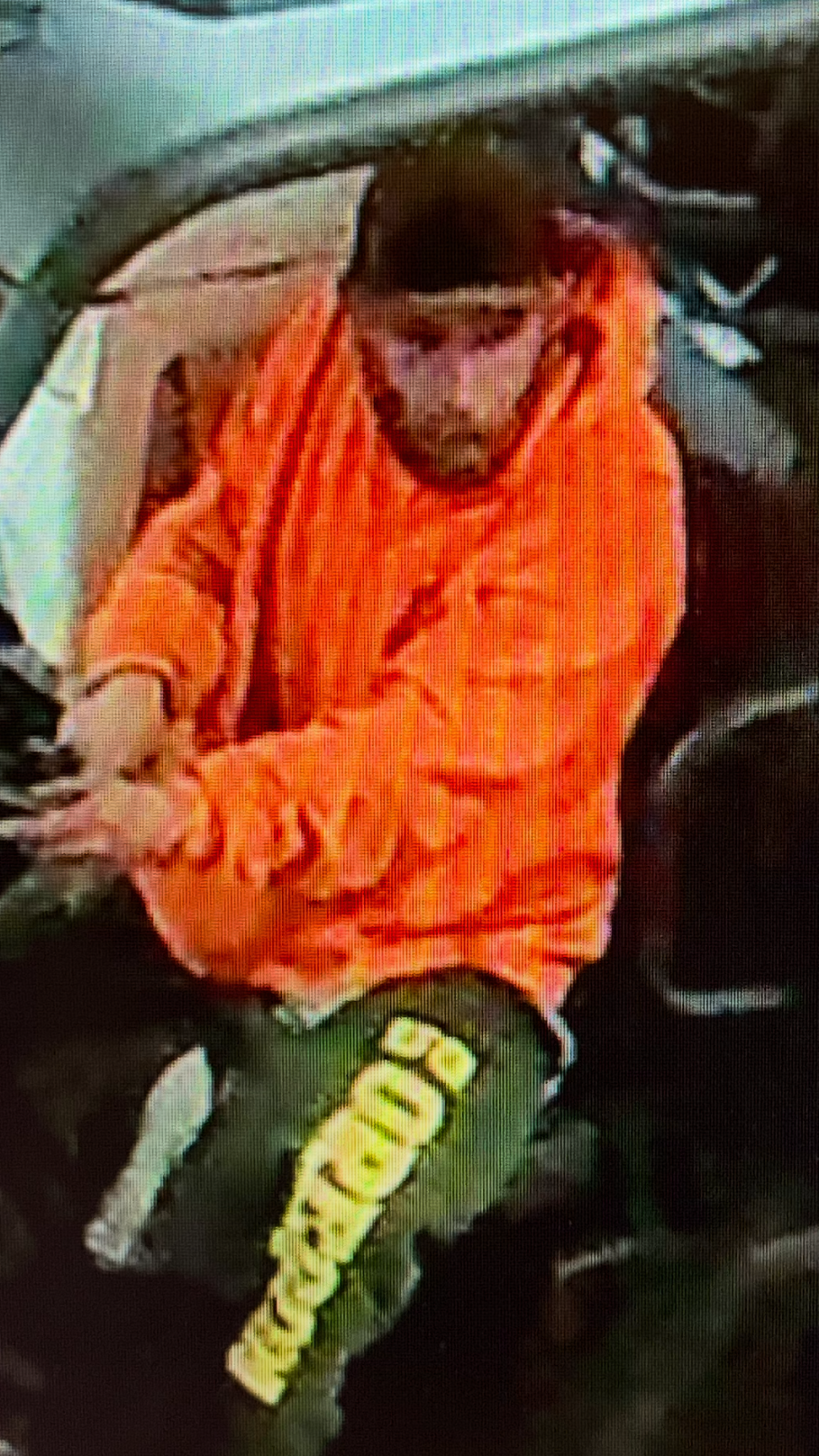 The suspect is described as a white male adult in his mid-30s, between 5 ft. 7 in. and 6 ft. tall, weighing approximately 180 to 225 pounds. He has red facial hair and was wearing an orange sweatshirt, green sweatpants with “UO Oregon” on the left leg, and a brown hat.