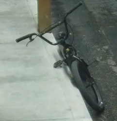 The suspect is described as either a white or Hispanic adult male, likely in his 20s or 30s and approximately 5 feet 8 inches tall. He was wearing a black hooded sweatshirt, a black baseball cap, light gray jeans, and black latex work gloves. His bicycle is a black BMX with a rear brake.