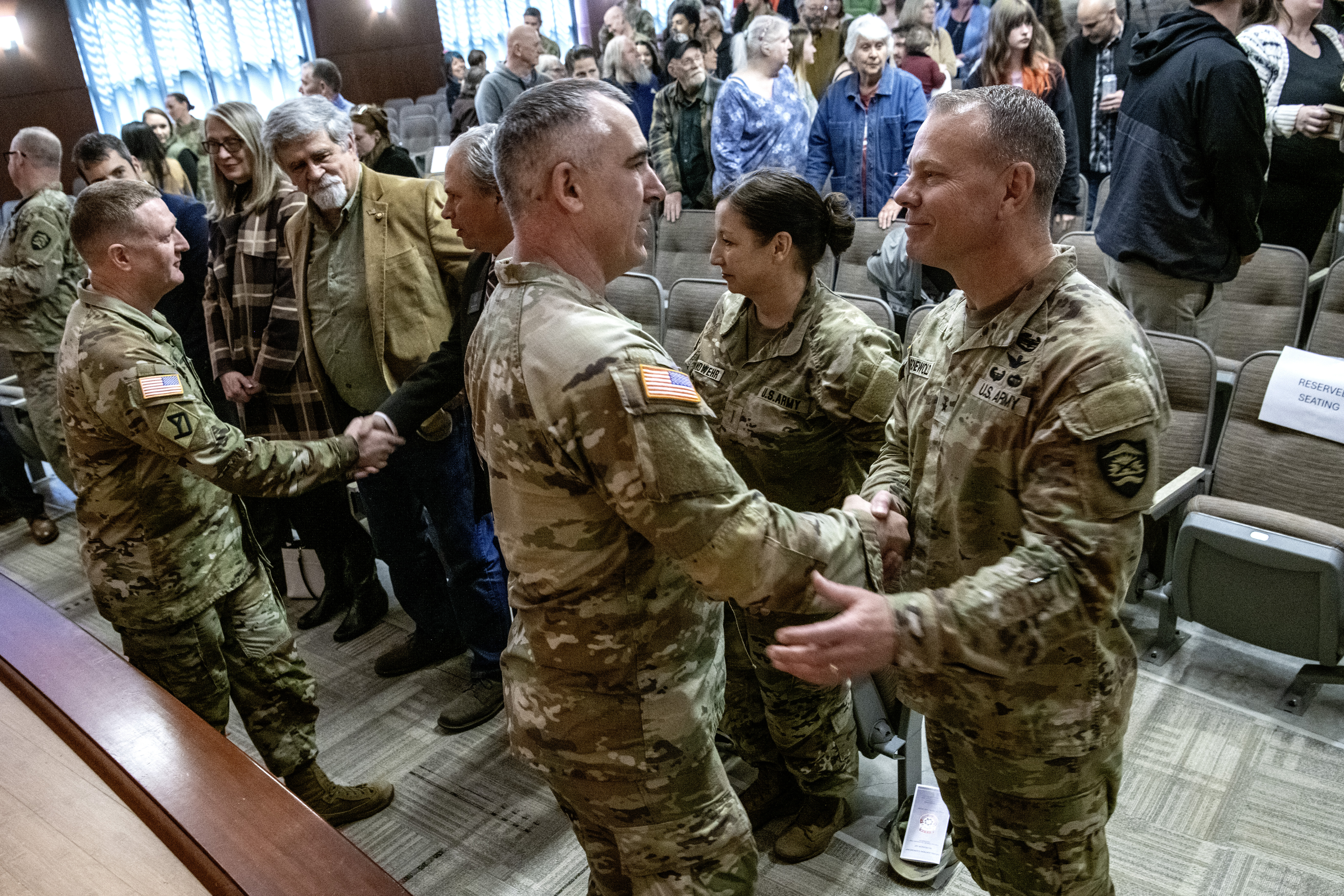 260415-Z-CH590-1046: Brig. Gen. Alan R. Gronewold, Adjutant General for the Oregon National Guard (right), greets Soldiers assigned to the 150th Test, Measurement and Diagnostic Equipment Support Detachment, at the conclusion of the unit’s formal mobilization ceremony held at Camp Withycombe, in Happy Valley, Oregon, on April 15, 2026, to support U.S. Central Command in the Middle East. The 150th TMDE is a key sustainment asset for the Army National Guard, maintaining accurate diagnostic equipment, ensuring compliance with Army calibration standards, and supporting unit readiness for all missions. (Oregon National Guard photo by John Hughel)