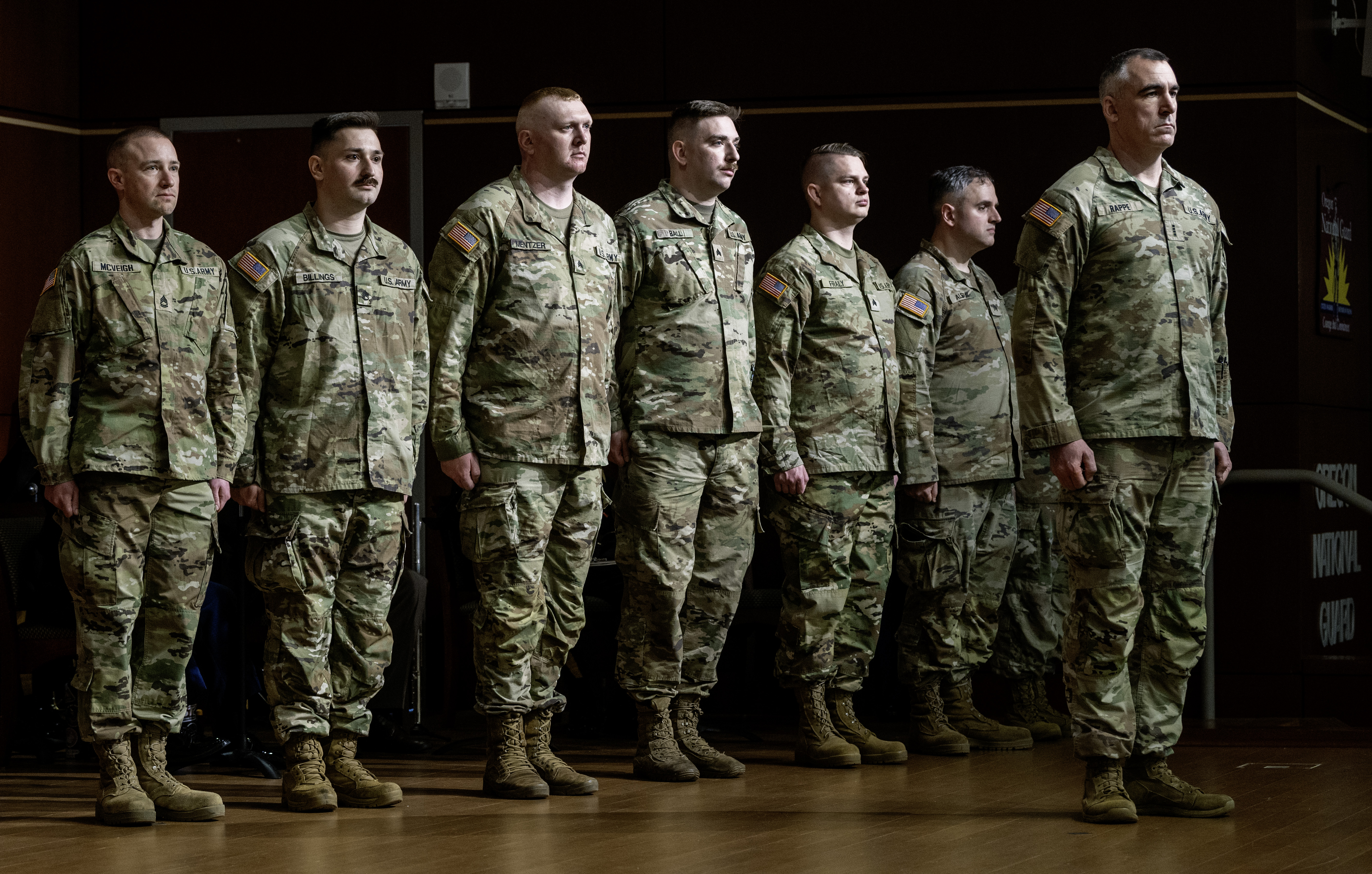 260415-Z-CH590-1056: Oregon Army National Guard Soldiers of the 150th Test, Measurement, and Diagnostic Equipment Support Detachment stand in formation during their mobilization ceremony held at Camp Withycombe, in Happy Valley, Oregon, on April 15, 2026, to support U.S. Central Command in the Middle East. The 150th TMDE is a key sustainment asset for the Army National Guard, maintaining accurate diagnostic equipment, ensuring compliance with Army calibration standards, and supporting unit readiness for all missions. (Oregon National Guard photo by John Hughel)
