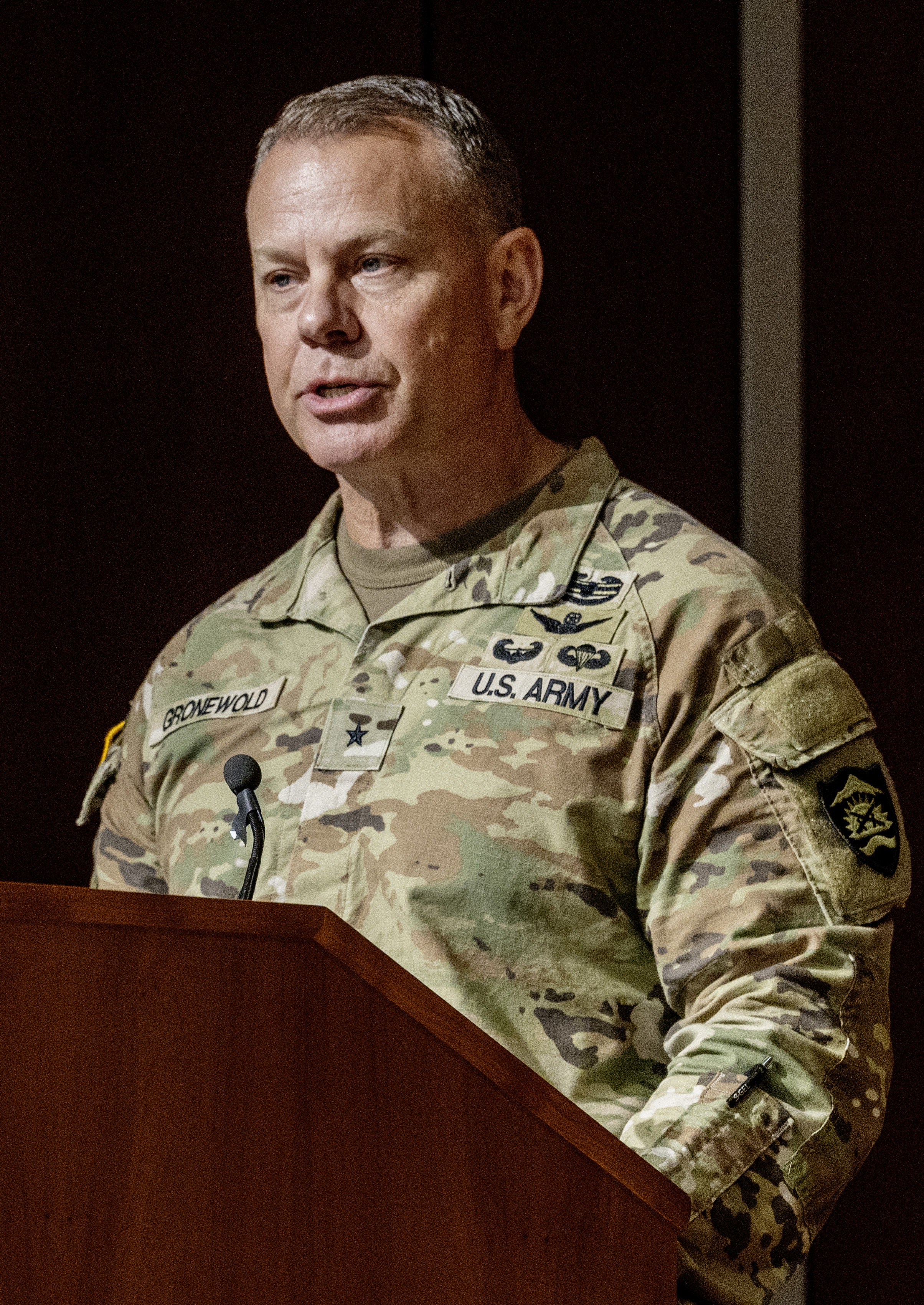 260415-Z-CH590-1083: Brig. Gen. Alan R. Gronewold, Adjutant General for the Oregon National Guard, delivers remarks to Oregon Army National Guard Soldiers and family members assigned to the 150th Test, Measurement and Diagnostic Equipment Support Detachment as they are mobilized on April 15, 2026, for assignment in the Middle East. The 150th TMDE is a key sustainment asset for the Army National Guard, maintaining accurate diagnostic equipment, ensuring compliance with Army calibration standards, and supporting unit readiness for all missions. (Oregon National Guard photo by John Hughel)