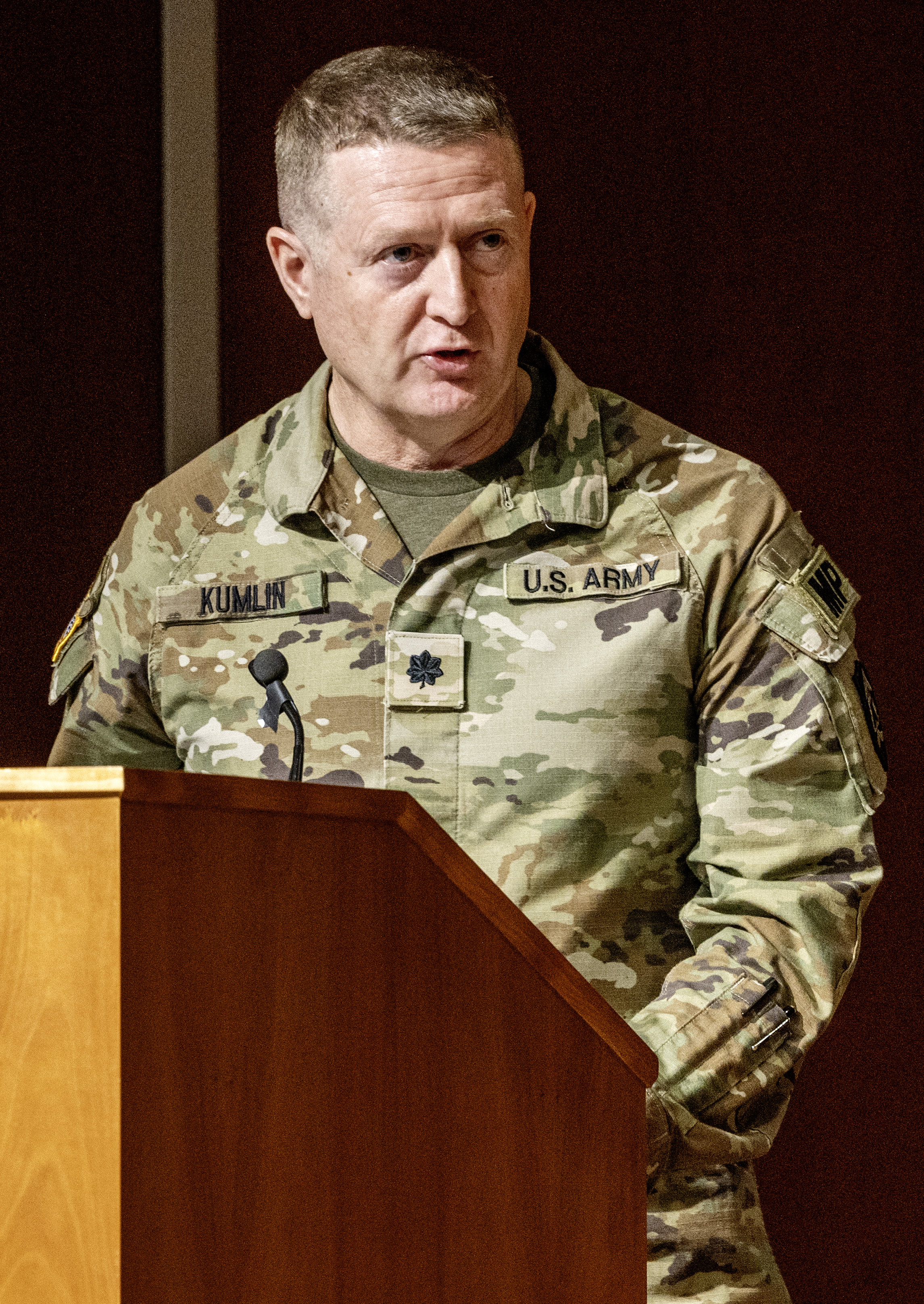 260415-Z-CH590-1123: Oregon Army National Guard Lt. Col. Rocky Kumlin, 821st Troop Command Battalion, delivers remarks to Oregon Army National Guard Soldiers and family members assigned to the 150th Test, Measurement and Diagnostic Equipment Support Detachment as they are mobilized on April 15, 2026, for assignment in the Middle East. The 150th TMDE is a key sustainment asset for the Army National Guard, maintaining accurate diagnostic equipment, ensuring compliance with Army calibration standards, and supporting unit readiness for all missions. (Oregon National Guard photo by John Hughel)